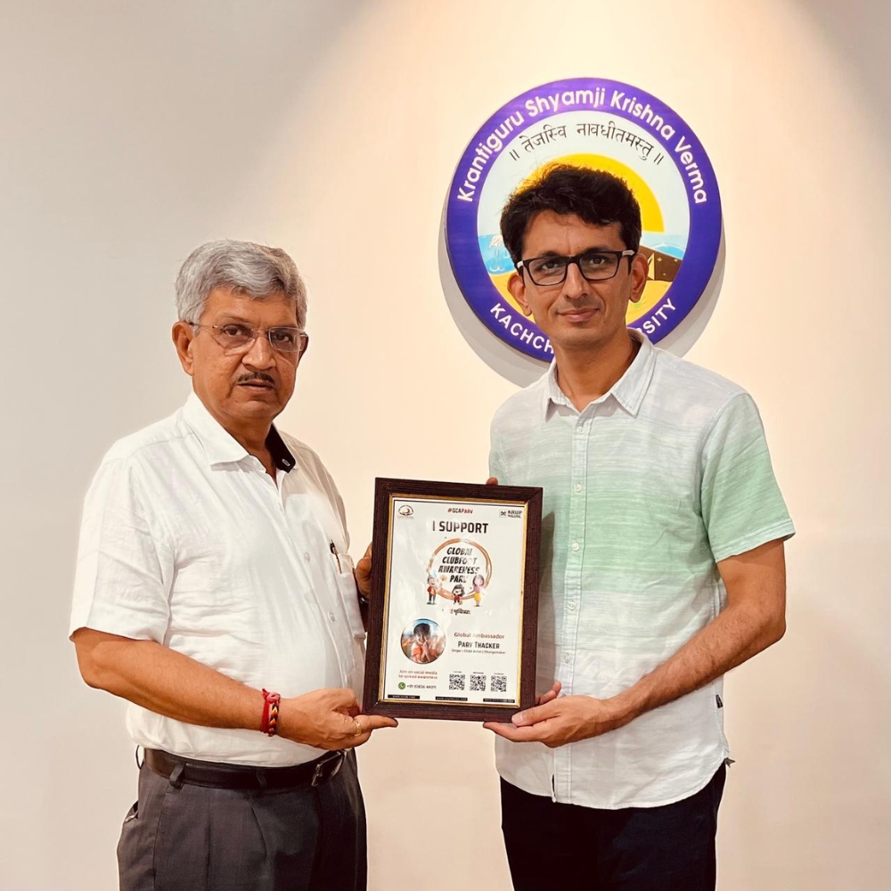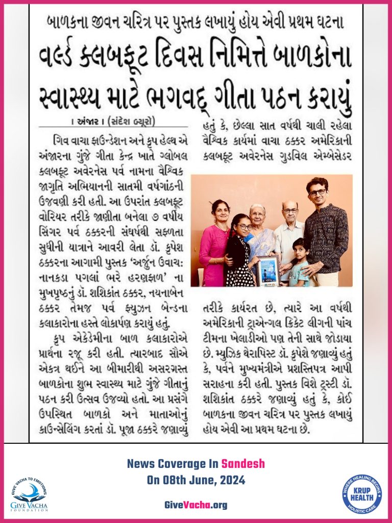 સમગ્ર વિશ્વમાં 3 જૂન વિશ્વ ક્લબફૂટ દિવસ તરીકે ઉજવાય છે, ત્યારે ગિવ વાચા ફાઉન્ડેશન અને કૃપ હેલ્થ એ અંજારના ગૂંજે ગીતા કેન્દ્ર ખાતે ગ્લોબલ ક્લબફૂટ અવેરનેસ પર્વ નામના વૈશ્વિક જાગૃતી અભિયાનની સાતમી વર્ષગાંઠની અનેરી ઉજવણી કરી. એ સાથે જ ક્લબફૂટ વોરિયર તરીકે જાણીતા બનેલા વિશ્વના યંગેસ્ટ સિંગર અને એક્ટર ૭ વર્ષીય પર્વ ઠક્કર ની સંઘર્ષથી સફળતા સુધીની યાત્રાને આવરી લેતા ડૉ. કૃપેશ ઠક્કર ના આગામી પુસ્તક “અર્જુન ઉવાચ: નાનકડા પગલાં ભરે હરણફાળ” ના મુખપૃષ્ઠનું ડૉ. શશીકાંત ઠક્કર, શ્રીમતી નયનાબેન ઠક્કર તેમજ પર્વ ફ્યુઝન બેન્ડના કલાકારોના હસ્તે લોકાર્પણ કરવામાં આવ્યું.